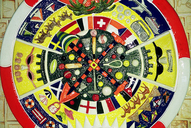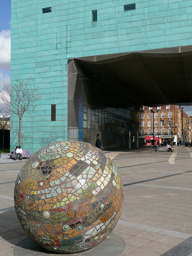 2m diameter) in steel, concrete and ceramic mosaic, located outside the award winning Alsop/Stormer